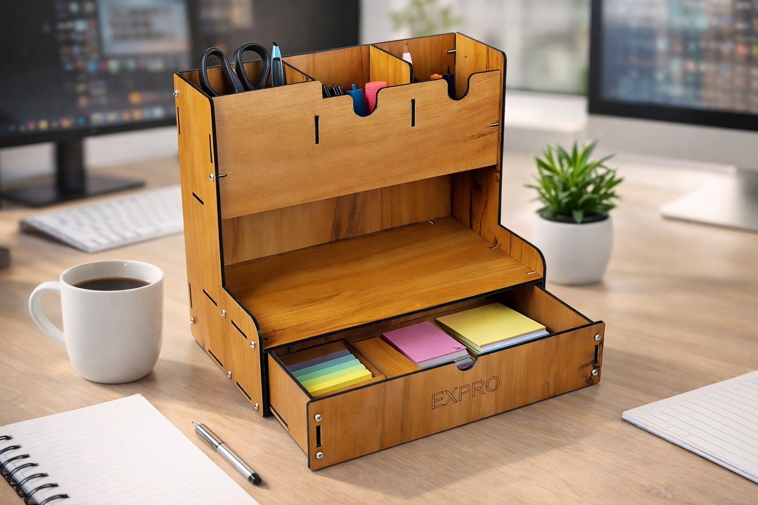 Stay organized and elevate your workspace with our 5-Compartment Wooden Desk Organizer.